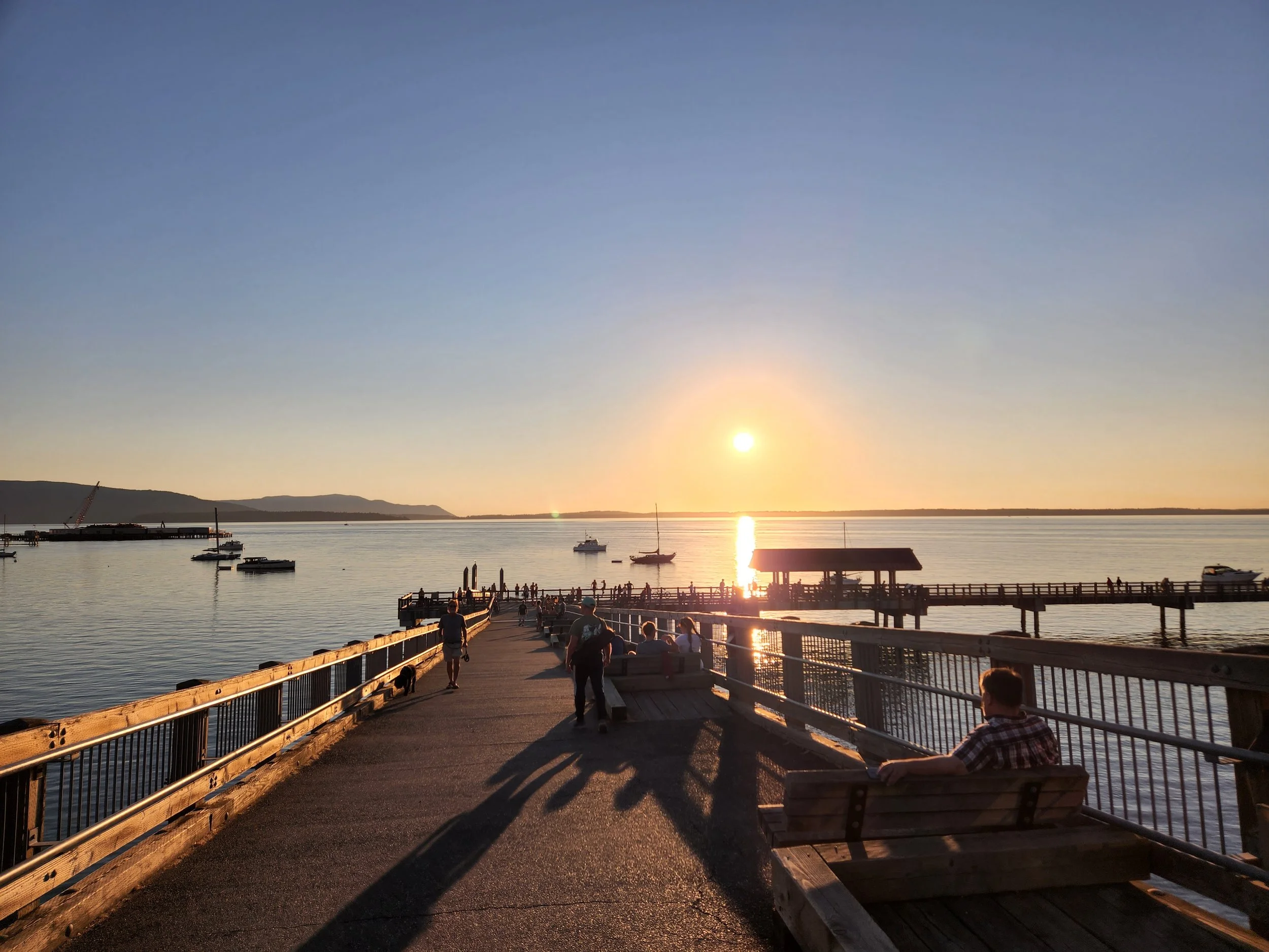 Taylor Dock overlooking Bellingham Bay at sunset.